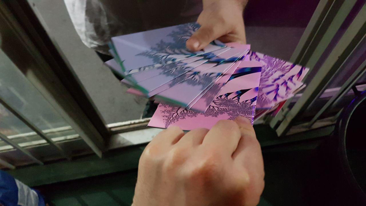 Con las imágenes de este video se realizó una serie de 100 tarjetas únicas, en la que cada una representa una parte del conjunto de Mandelbrot con una paleta de colores única.